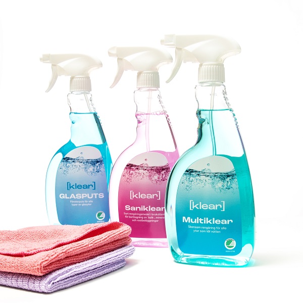 Under 2023 har vi lanserat ett antal nya produkter i Klearfamiljen. Ett diskmedel med mild doft av lavendel och en vårdande handtvål med Aloe vera. Båda i snyggt designade flaskor som gärna får stå framme. Multiklear är ett skonsamt och svanenmärkt rengöringsmedel för alla ytor som tål vatten. Saniklear används för borttagning av kalk- mineral och rostbeläggningar. Båda produkterna är förpackade i praktisk sprayflaska. Lätta och smidiga att använda. Just nu kan du testa tre Klearprodukter för endast 99 SEK! Rengöringskitet innehåller Klear Glasputs, Multiklear och Saniklear. Ultraklear är ett grovrengöringsmedel mot tuff smuts. Easy Glide är en produkt som blandas i hinken med vatten och fönstersåpa. Utmärkt när smutsen sitter hårt. Produkten har en liknande effekt som ammoniak, men är behagligare att arbeta med och betydligt mer miljövänlig. Klear Maskinrengöring rengör och tar bort kalk i disk- och tvättmaskiner. Resultatet blir skinande blankt samtidigt som du ökar livslängden på dina maskiner. Med gott underhåll av din disk- och tvättmaskin får du renare tvätt och disk samt en lägre energiförbrukning. Bra både för miljön och plånboken! Klear flytande tvättmedel passar för tvätt av alla typer av textilier, utom ull och silke.