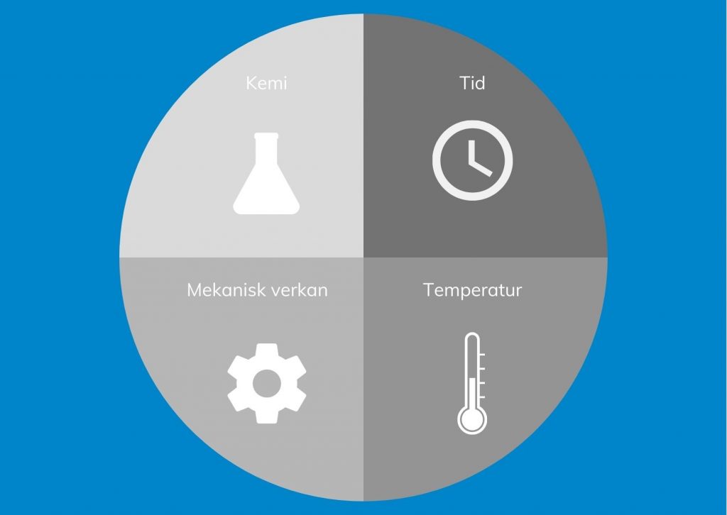 • Temperatur – ju högre temperatur desto lättare/enklare lösgörs smutsen. Exempelvis; kan det vid viss rengöring räcka med att ha en högre temperatur på vattnet för att rengöra en yta och kan då använda mindre kemikalier.