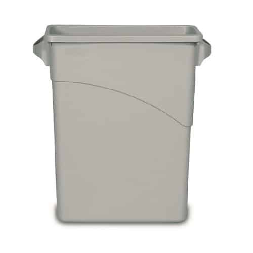En grå 60 liters avfallstunna som tar liten plats. Olika lock för olika ändamål. Kan även utrustas med vagnar som sätts ihop med varandra för att förenkla förflyttning.