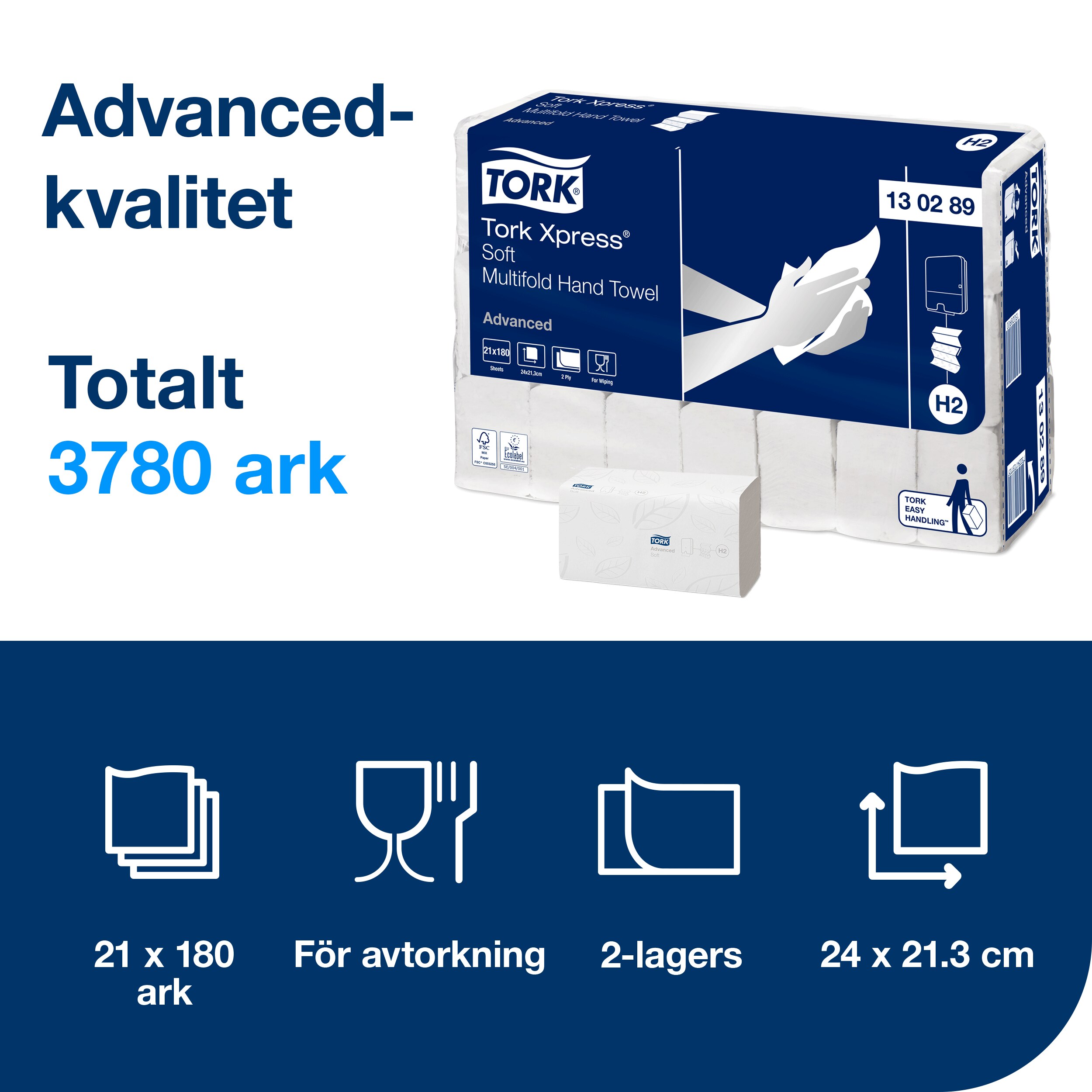 Tork Advanced H2 Multifold 2-lags pappershandduk 130289 erbjuder en smart och hygienisk lösning för företag som söker både kvalitet och effektivitet i sina hygienutrymmen. Denna multifold-handduk är specifikt framtagen för att fungera med Tork Xpress Dispenser, vilket innebär att Tork Advanced H2 Multifold handdukarna enkelt kan plockas ett ark i taget en design som både främjar god hygien och reducerar förbrukningen. Tack vare denna smarta utmatningsfunktion minskar risken för korskontaminering avsevärt, vilket gör den särskilt lämplig för platser där hygienkraven är höga, som i vårdinrättningar och livsmedelsmiljöer.