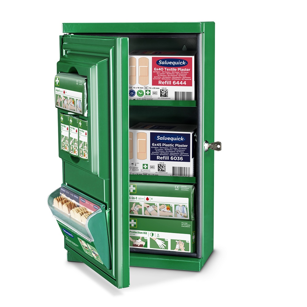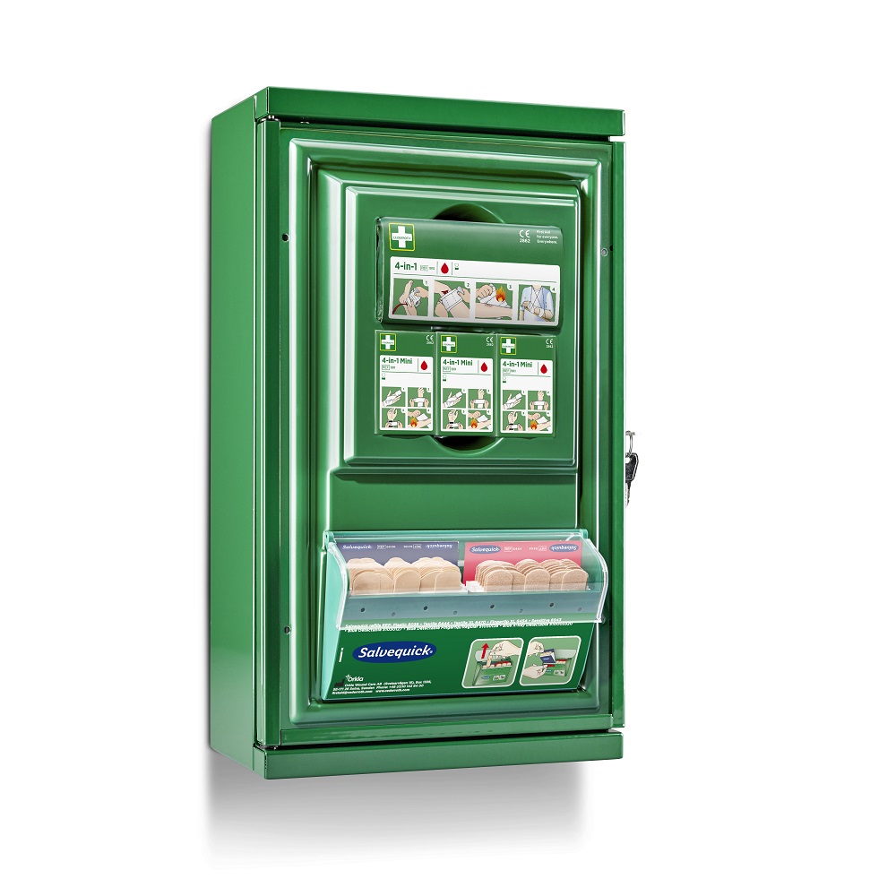 På utsidan finns en Salvequick Plåsterautomat med både textil och plastplåster för snabb behandling av mindre sår. Inuti skåpet förvaras bland annat 4 in 1 Blodstoppare, mini blodstoppare, extra plåsterrefiller samt Skyddspaket för säkrare HLR insatser .