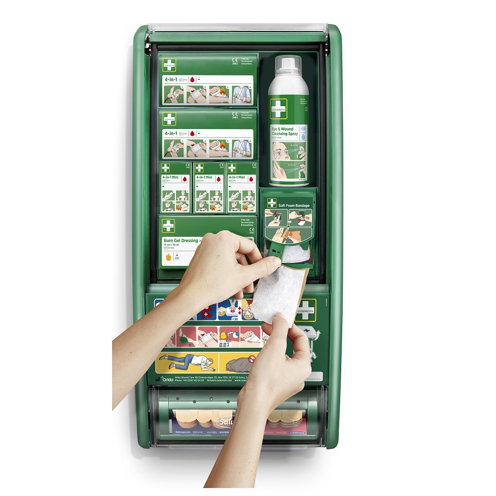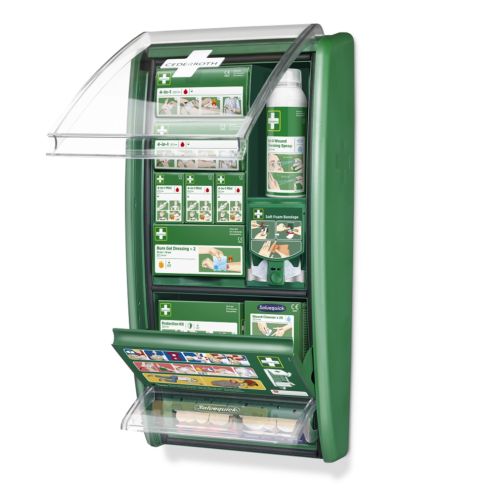 Cederroth Första Hjälpen Station First Aid är en komplett och välorganiserad första hjälpen-station som fungerar som basen i arbetsplatsens säkerhetsutrustning. Cederroth Första Hjälpen Station First Aid är utformad för att snabbt kunna hantera flera typer av skador - från mindre sår till brännskador och ögonolyckor och kan dessutom enkelt anpassas efter verksamhetens specifika behov .