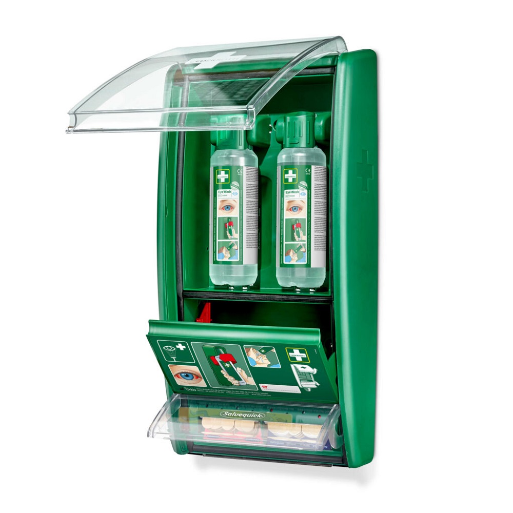 Cederroth Ögonduschstation Första Hjälpen innehåller två ögonduschflaskor om 500 ml och är dessutom utrustad med en integrerad Salvequick plåsterautomat. Plåstren dras nedåt för att minska risken att smutsa ner övrigt innehåll, och refillerna är fastlåsta för att inte försvinna. Tomma refiller lossas enkelt med medföljande specialnyckel .