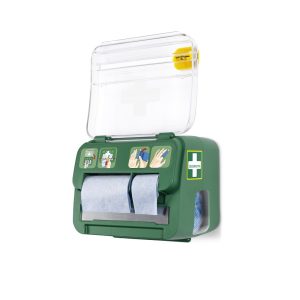 Cederroth Soft Foam Bandage Dispenser 2in1 är låst för att förhindra svinn och öppnas enkelt med refillnyckel. Den transparenta luckan skyddar innehållet mot damm och smuts samtidigt som det är lätt att se när påfyllning behövs .