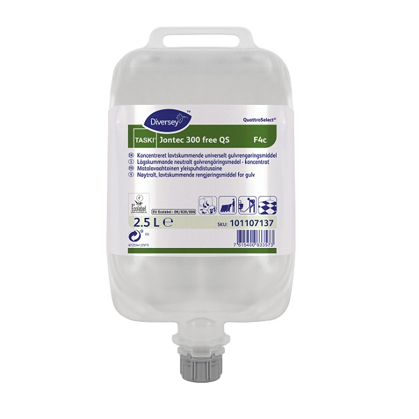 Jontec 300 free QS F4c är ett lågskummande, neutralt golvrengöringsmedel som är utmärkt för rengöring av alla vattentåliga hårda golv. Detta rengöringsmedel är särskilt utvecklat för effektiv användning i kombiskurmaskiner och är idealiskt för golv med polishskikt. Dess pH-neutrala formula garanterar att inga rester lämnas kvar på golvytan och är fri från parfym och färgämnen, vilket gör det lämpligt för användning i miljöer där luktfri rengöring är önskvärd.