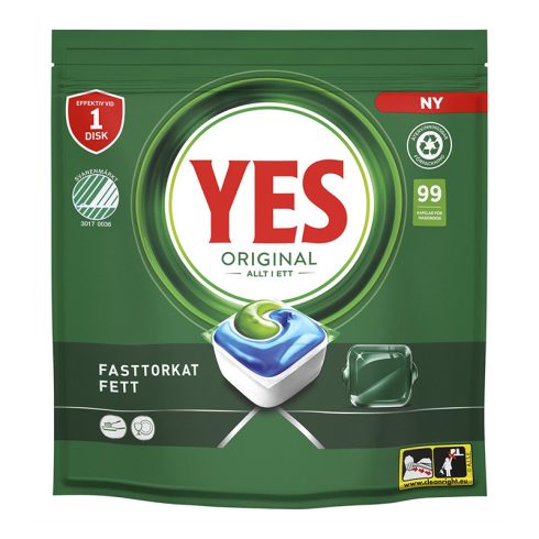 Yes Original All in One diskmaskinstabletter tar effektivt bort intorkat fett och envisa matrester, vilket ger en gnistrande ren disk varje gång. Kapseln kombinerar vätska och pulver för att maximera rengöringskraften, och det snabbt upplösande höljet ser till att rengöringen börjar omedelbart efter kontakt med vatten.