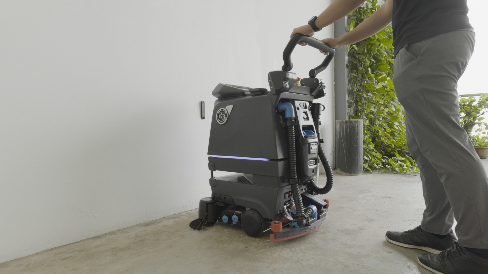 Med ett tryck nedåt på 8 kg och borstalternativ för ett brett utbud av golvtyper, ger R3 Scrub Pro professionell rengöring i de trångaste utrymmena.