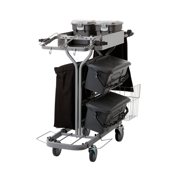 Vagnen kan anpassas med olika tillbehör för att optimera dess användning för specifika behov och arbetsmiljöer. Den är perfekt för företag som behöver en smidig och anpassningsbar lösning för daglig rengöring utan att kompromissa med effektiviteten.