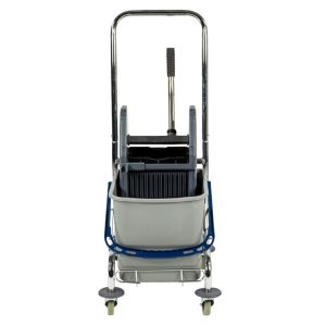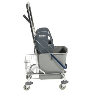 Stativet i krompläterad metall är inte bara slitstarkt utan även praktiskt - utrustat med både skjuthandtag och en integrerad förvaringskorg som ger plats för städmaterial och tillbehör. Den kompakta storleken gör att svabbvagn Sprintus 27L förkromad är lätt att hantera även i mindre utrymmen, utan att kompromissa med prestanda.