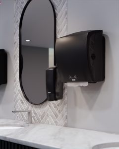 En av de mest framträdande egenskaperna är punktskriften på tryckknappen, vilket underlättar användning för personer med synnedsättning. Detta, i kombination med en heltäckande tryckyta, säkerställer att dispensern är lätt att använda för alla, oavsett fysiska begränsningar. Dessutom bidrar dispenserns kontrasterande färg till synlighet mot bakgrundsväggen, vilket ytterligare förbättrar tillgängligheten.