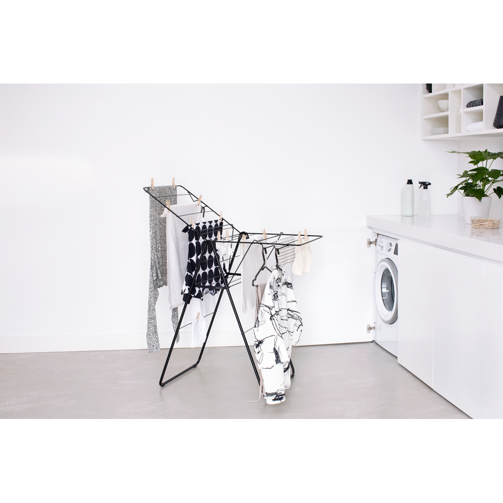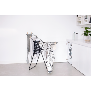 Torkställningen är enkel att fälla ut och lika enkel att fälla ihop för förvaring. Den är utrustad med justerbara torkvingar som gör det möjligt att hänga både små plagg och längre textilier som byxor och handdukar. På sidostället finns även plats för galgar - perfekt för skjortor som behöver lufttorka utan veck.