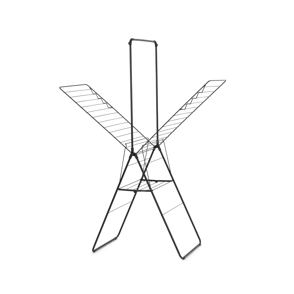 Torkställning Brabantia HangOn 25m Matt Svart är hopfällbar och försedd med transportlås och barnsäkring, vilket ger trygg hantering även när den är i bruk. Designen är robust, och tack vare sin mattsvarta finish blir den ett diskret, stilrent inslag i hemmet.