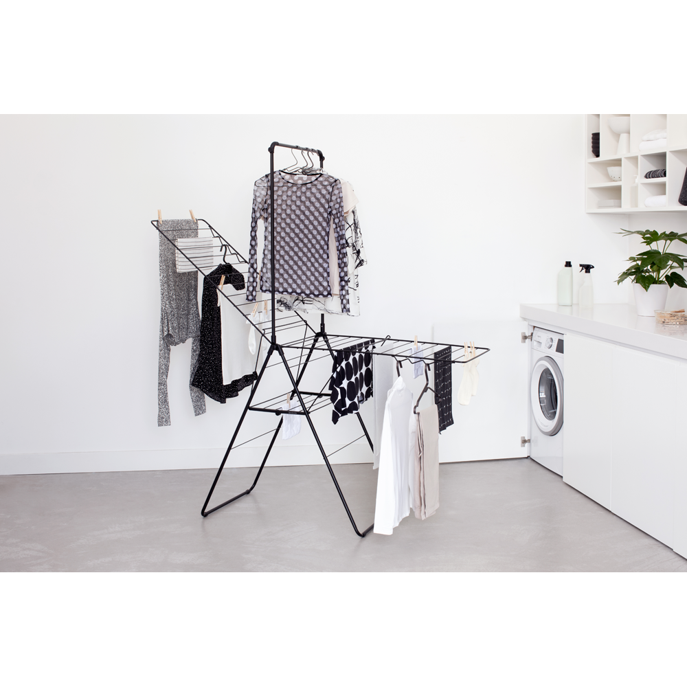 Torkställning Brabantia HangOn 25m Matt Svart är en elegant och praktisk lösning för dig som vill torka tvätt inomhus på ett energieffektivt och stilrent sätt. Med hela 25 meter torkyta rymmer ställningen upp till tre fulla maskintvättar, vilket gör den idealisk för både större hushåll och mindre hem med begränsad torkplats.